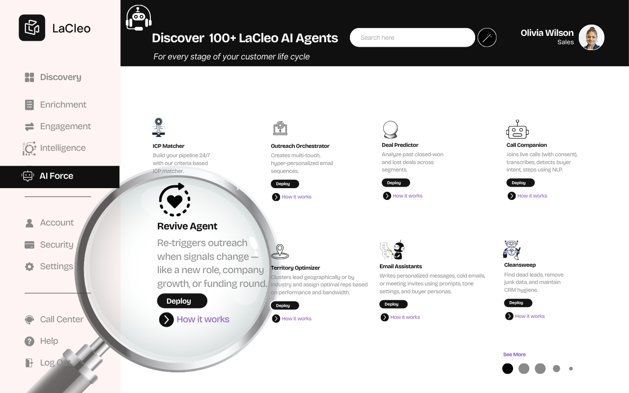 LaCleo AI Force is your personalized playlist of AI agents, built to automate lead generation and sales workflows. Discover leads, enrich data, engage prospects, and sync your CRM — all with a click.